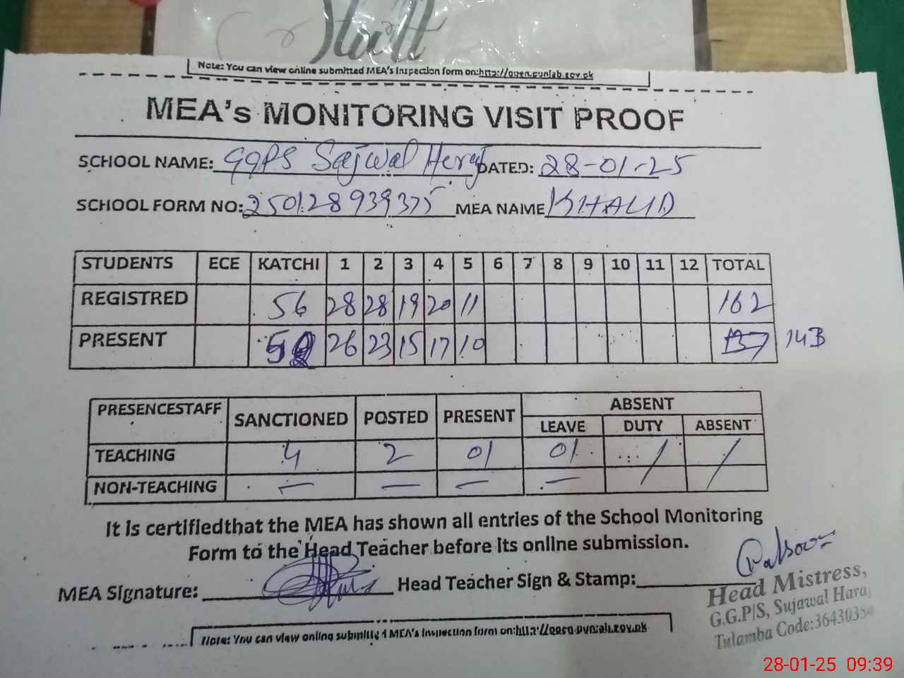 | Attendance Register | Head Teacher | MEA with School | Visit Proof |