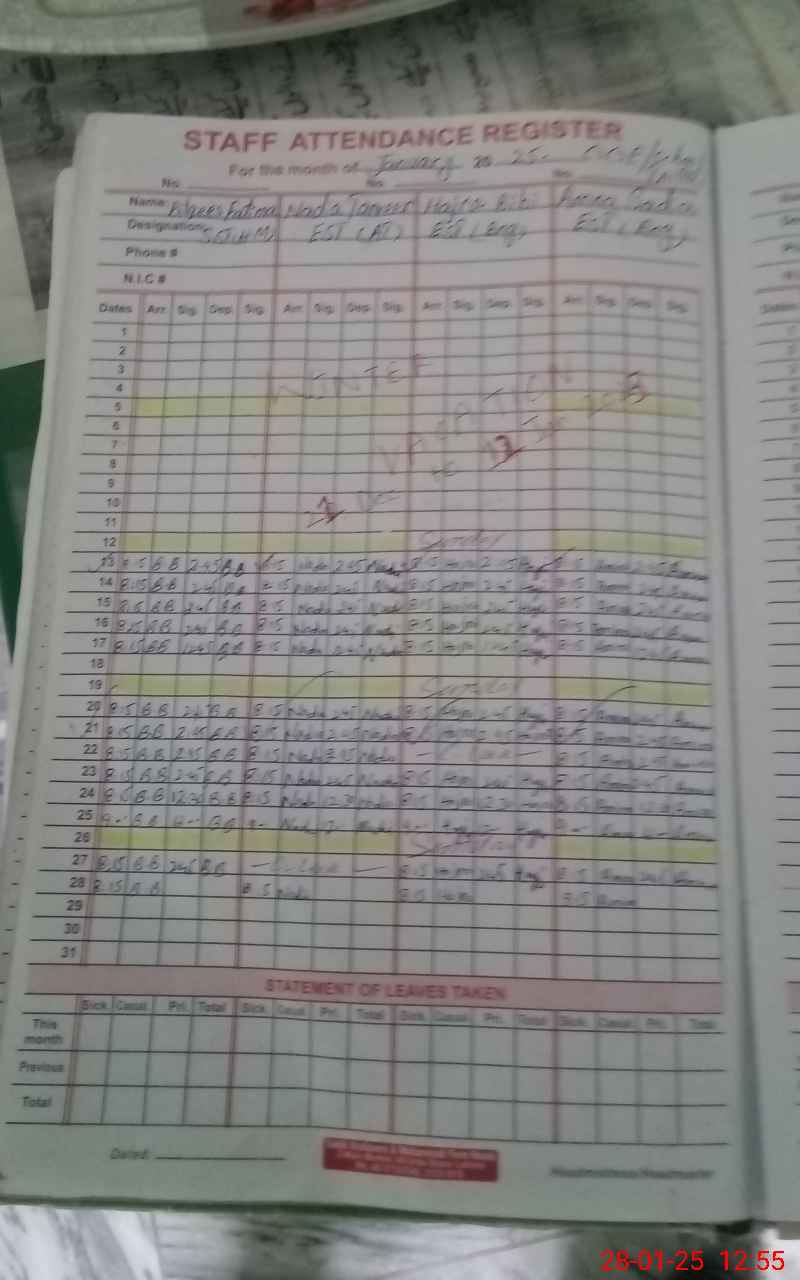 | CNIC | Full Name | Designation | R/C | Absence During Last Calender Month |