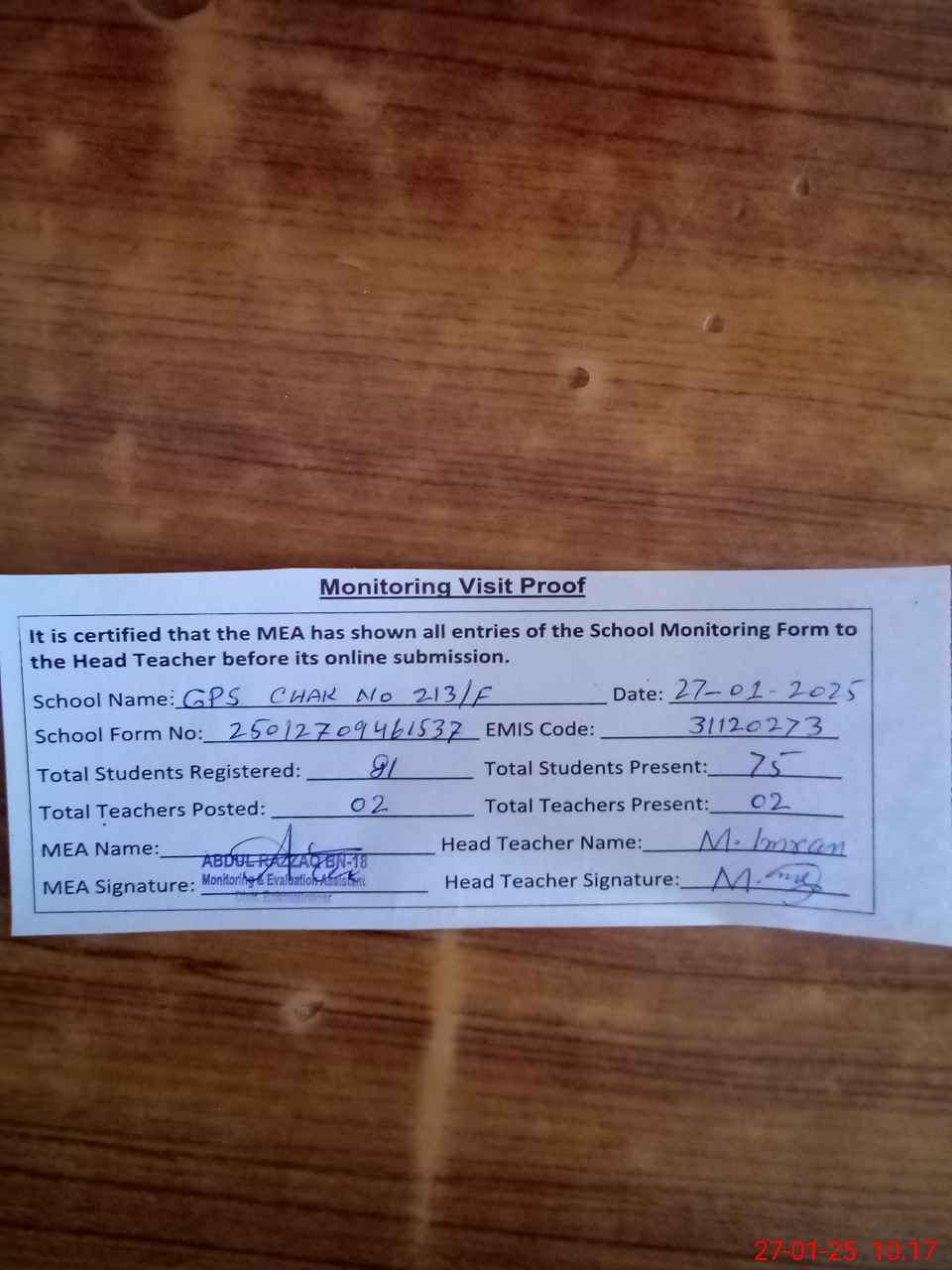| EMIS Code: 31120273 | Name of School: GPS CHAK NO 213/F | |||
