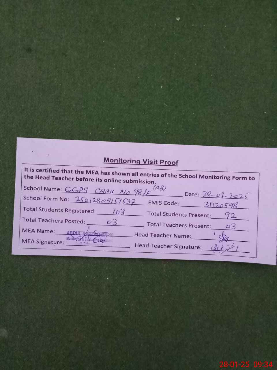 | Attendance Register | Head Teacher | MEA with School | Visit Proof |
