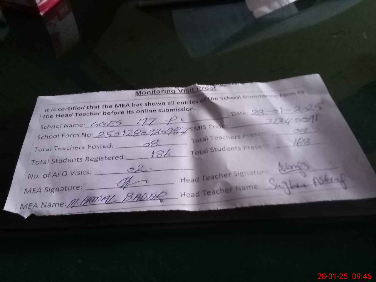 | Attendance Register | Head Teacher | MEA with School | Visit Proof |