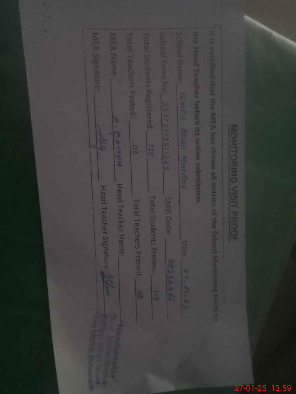 | Attendance Register | Head Teacher | MEA with School | Visit Proof |