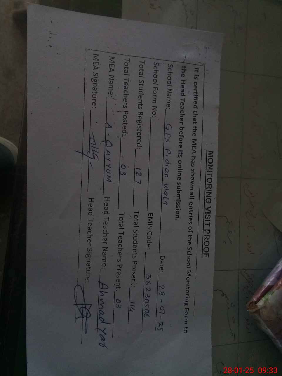 | Attendance Register | Head Teacher | MEA with School | Visit Proof |
