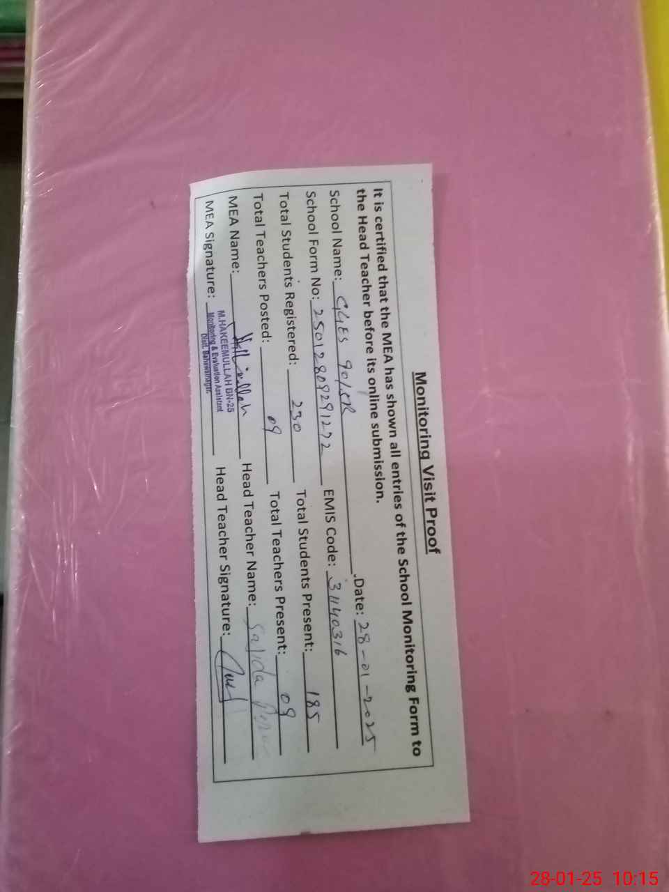 | Attendance Register | Head Teacher | MEA with School | Visit Proof |