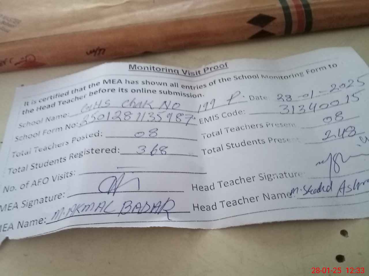 | EMIS Code: 31340015 | Name of School: GHS CHAK NO.199/P SADIQABAD | |||