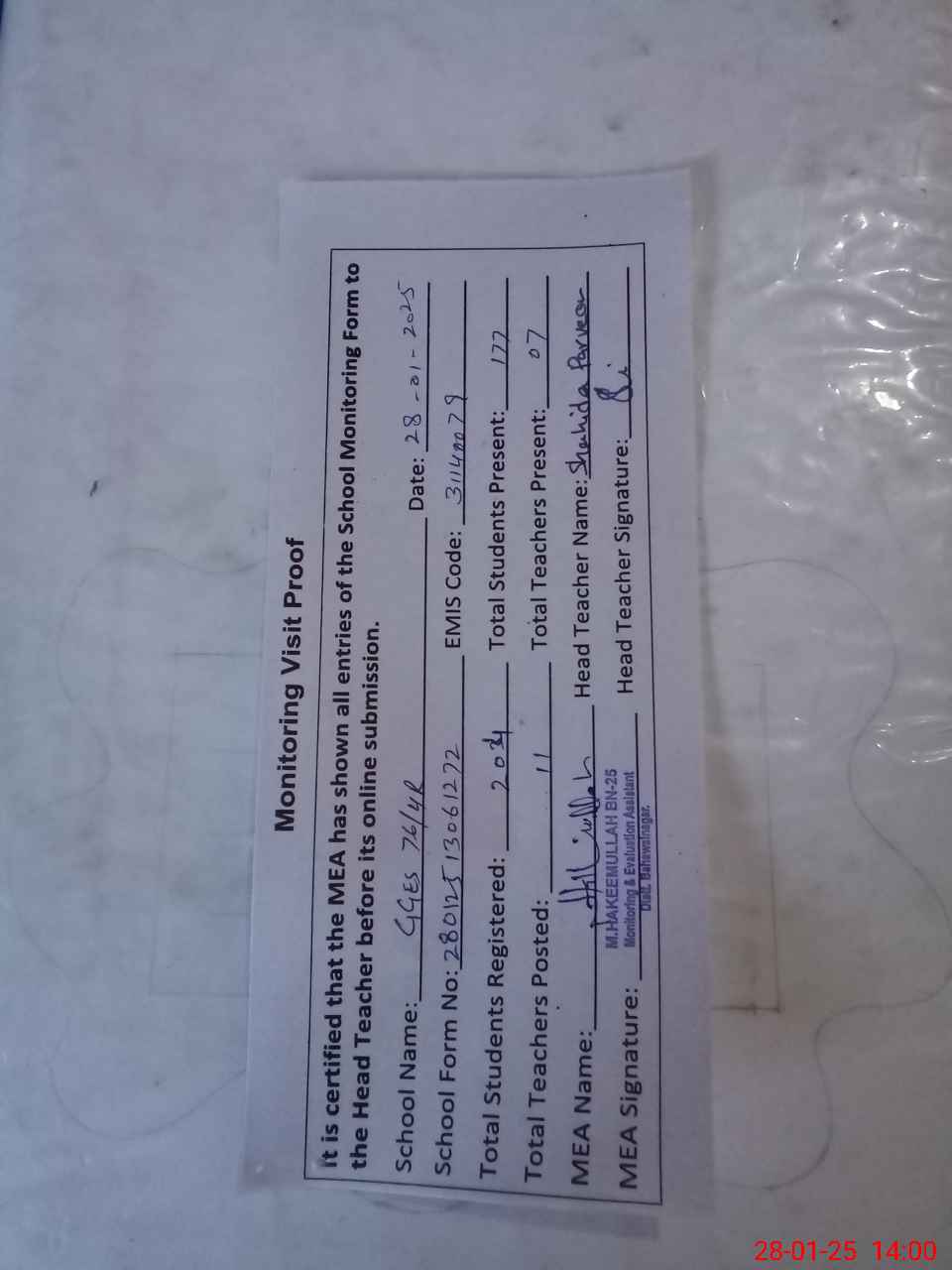 | Attendance Register | Head Teacher | MEA with School | Visit Proof |