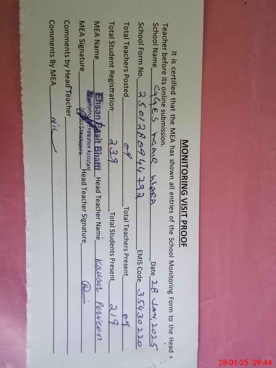 | Attendance Register | Head Teacher | MEA with School | Visit Proof |