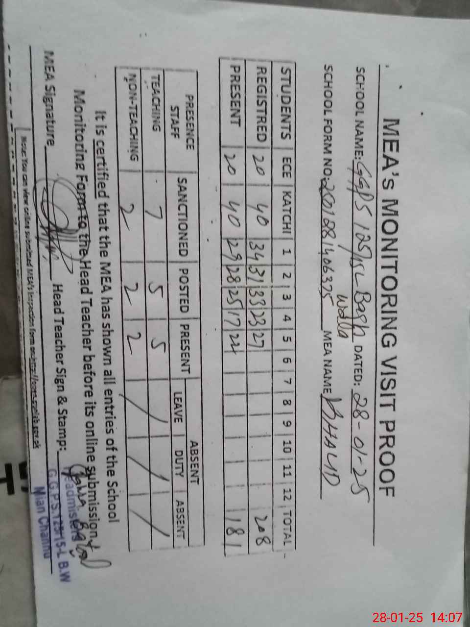 | Attendance Register | Head Teacher | MEA with School | Visit Proof |