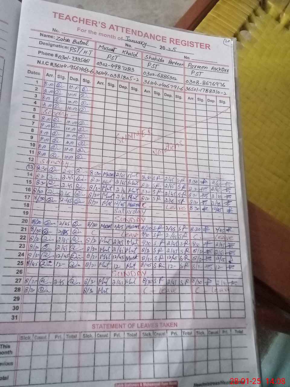 | Name: Za**** Ba**** Designation: (School Headmaster's/Headmistress's) PST Phone/Cell Number: 03**** |