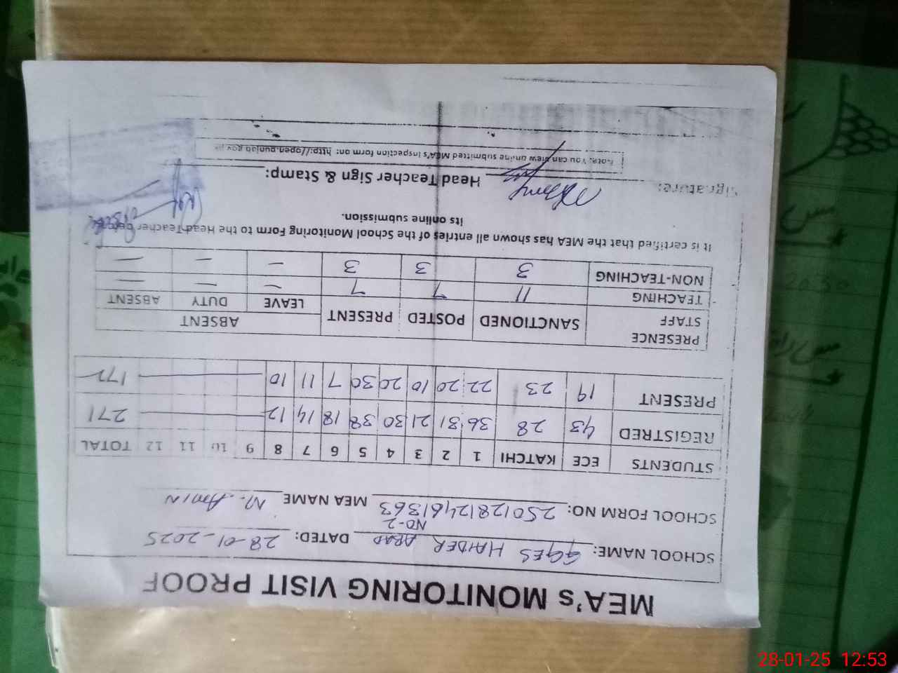 | Attendance Register | Head Teacher | MEA with School | Visit Proof |