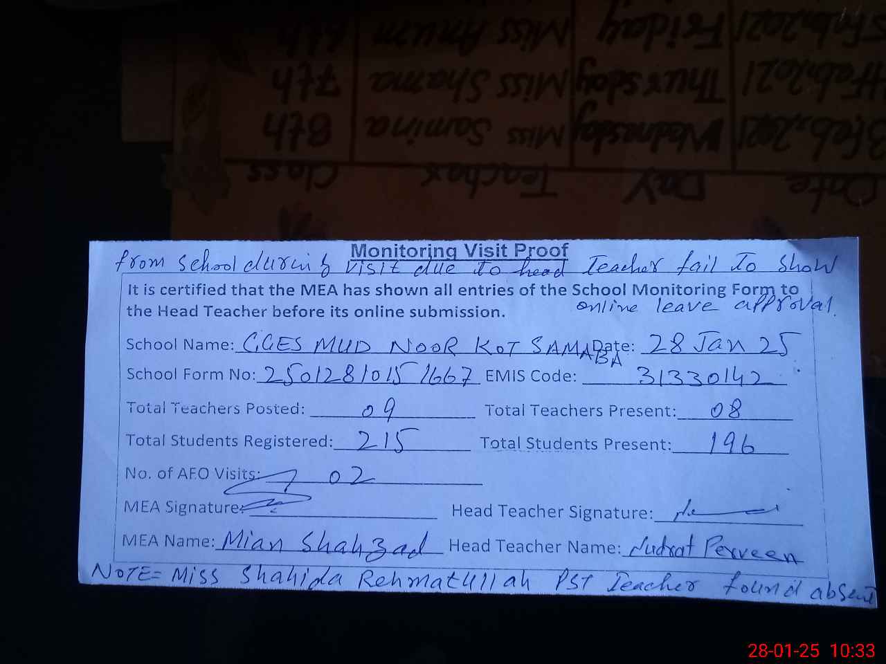 | Remarks (Use Separate Page if Required): Miss Shahida Parveen PST teacher found absent from school during visit due to head teacher fail to show online leave approval | |||||