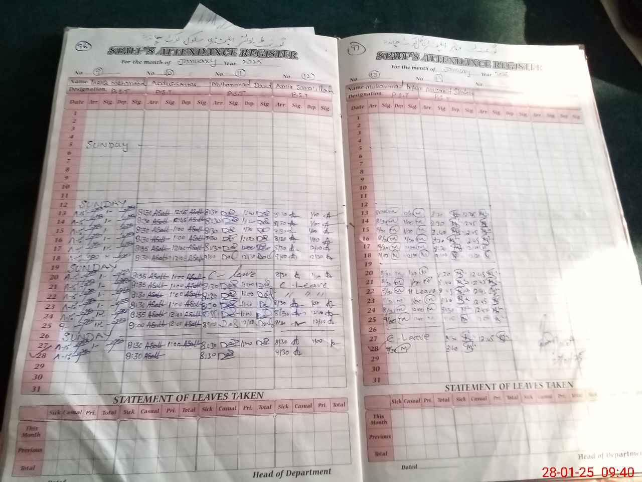 | CNIC | Full Name | Designation | R/C | Absence During Last Calender Month |