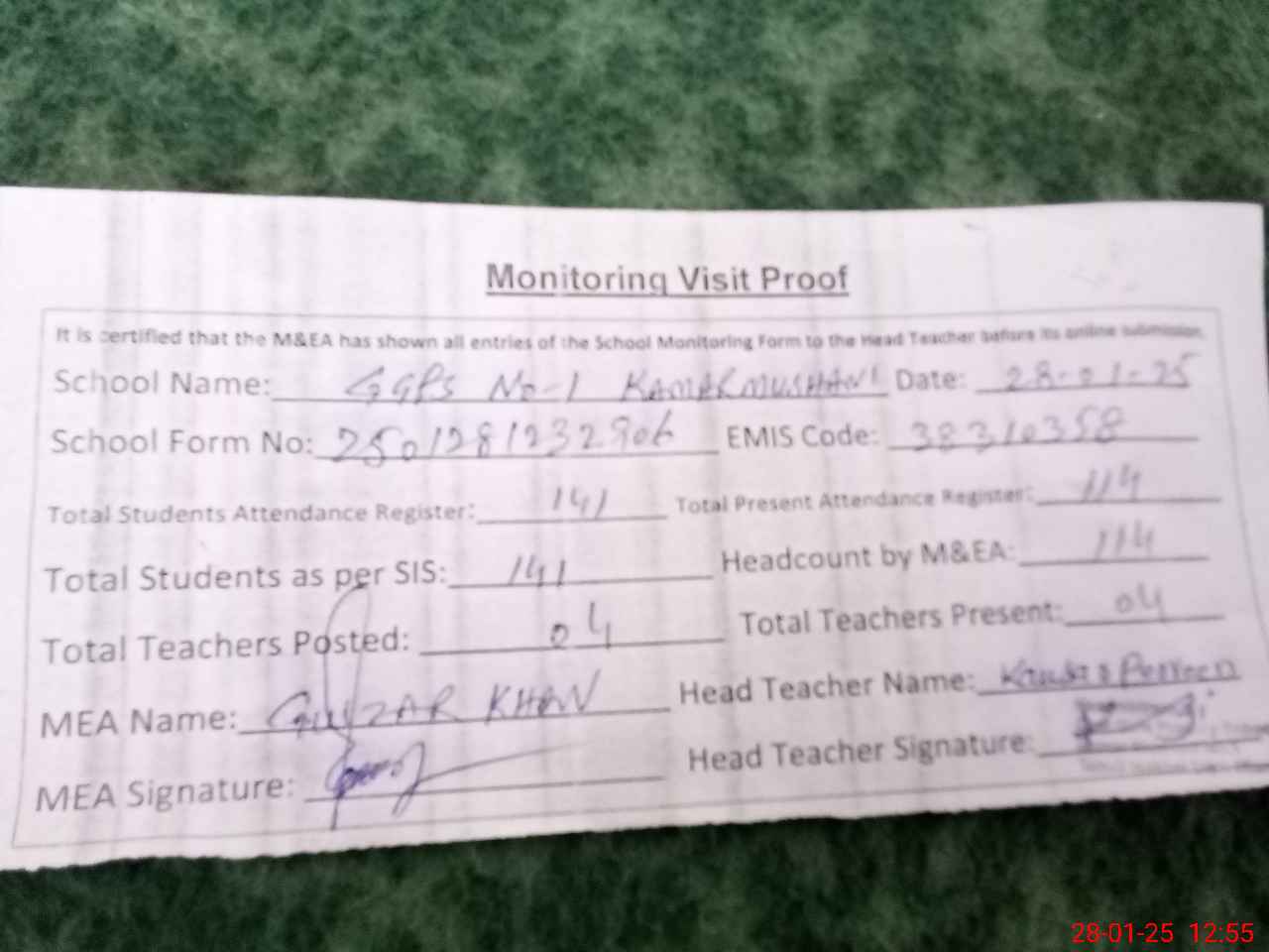 | Attendance Register | Head Teacher | MEA with School | Visit Proof |