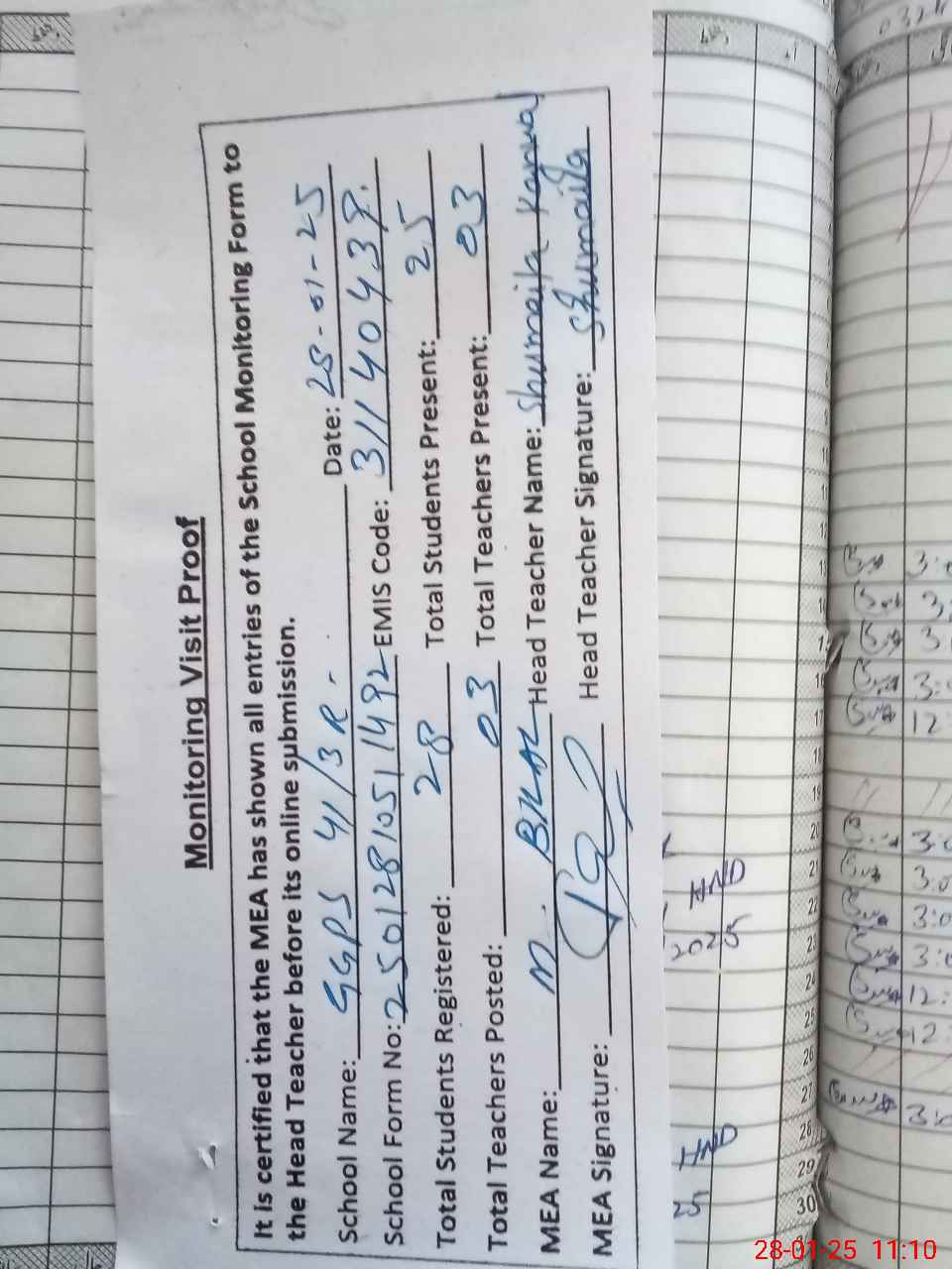 | Attendance Register | Head Teacher | MEA with School | Visit Proof |