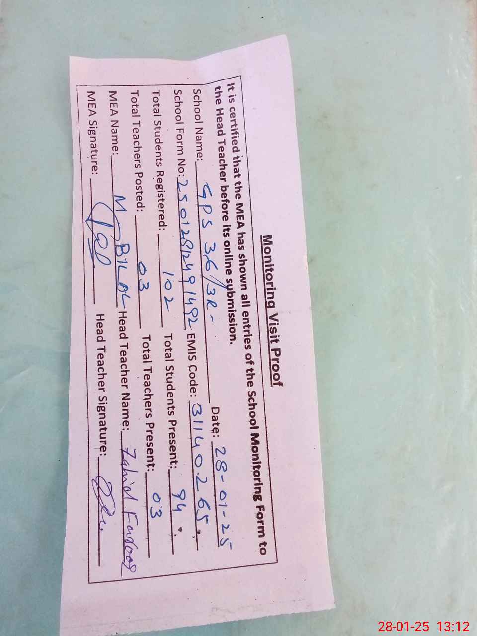 | Attendance Register | Head Teacher | MEA with School | Visit Proof |