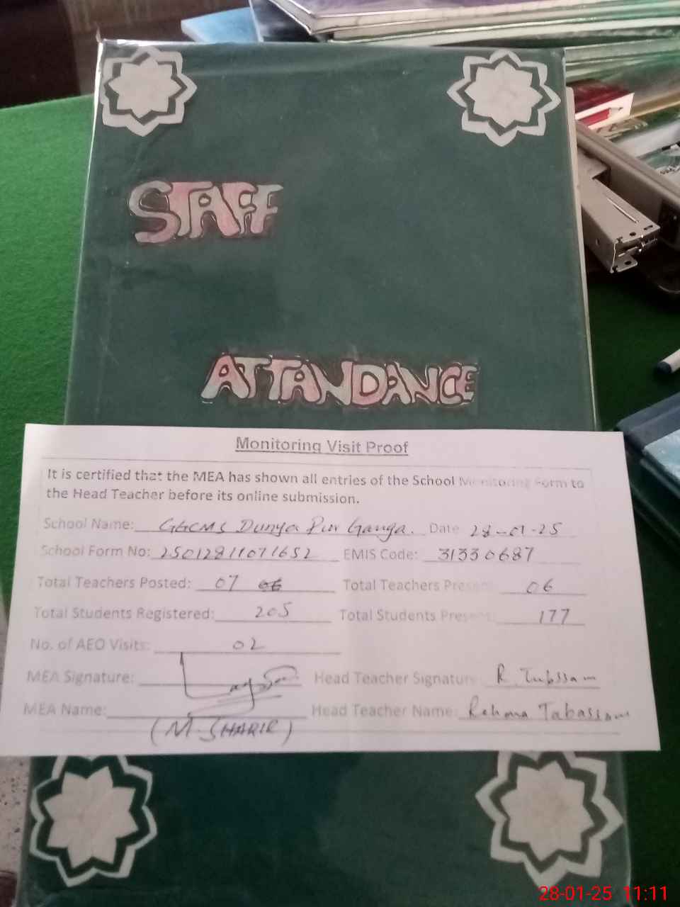 | Attendance Register | Head Teacher | MEA with School | Visit Proof |
