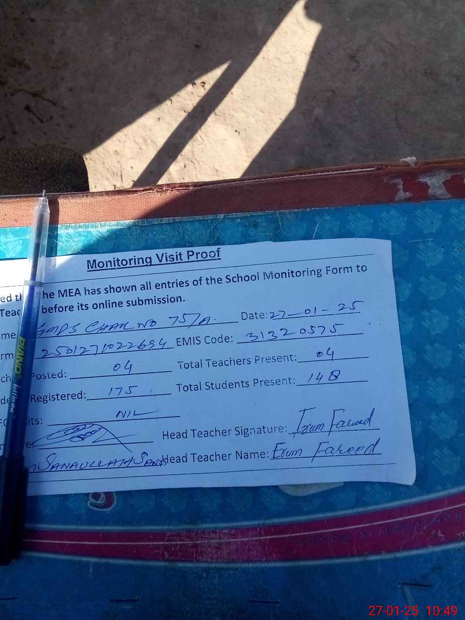 | Attendance Register | Head Teacher | MEA with School | Visit Proof |