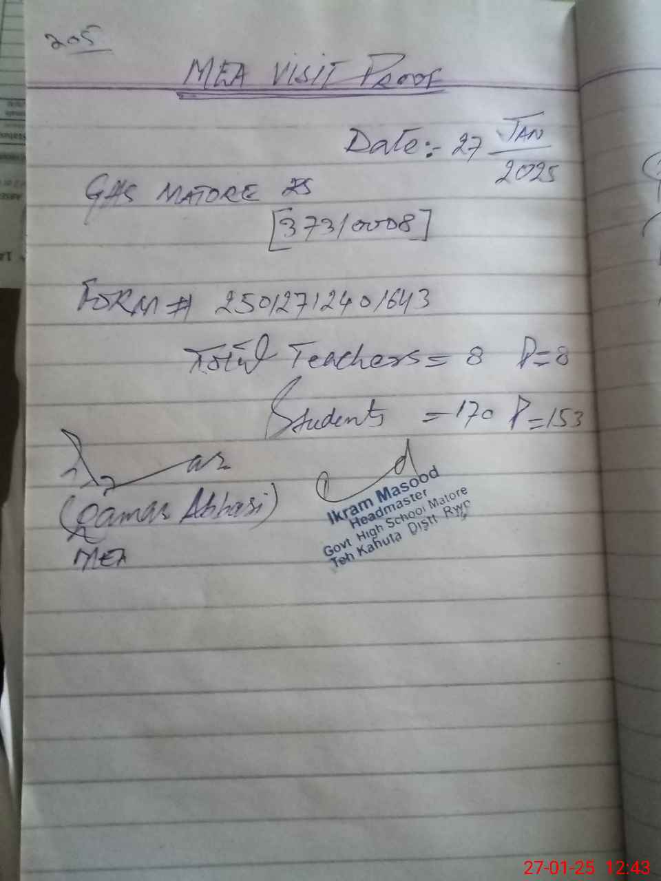 | Attendance Register | Head Teacher | MEA with School | Visit Proof |