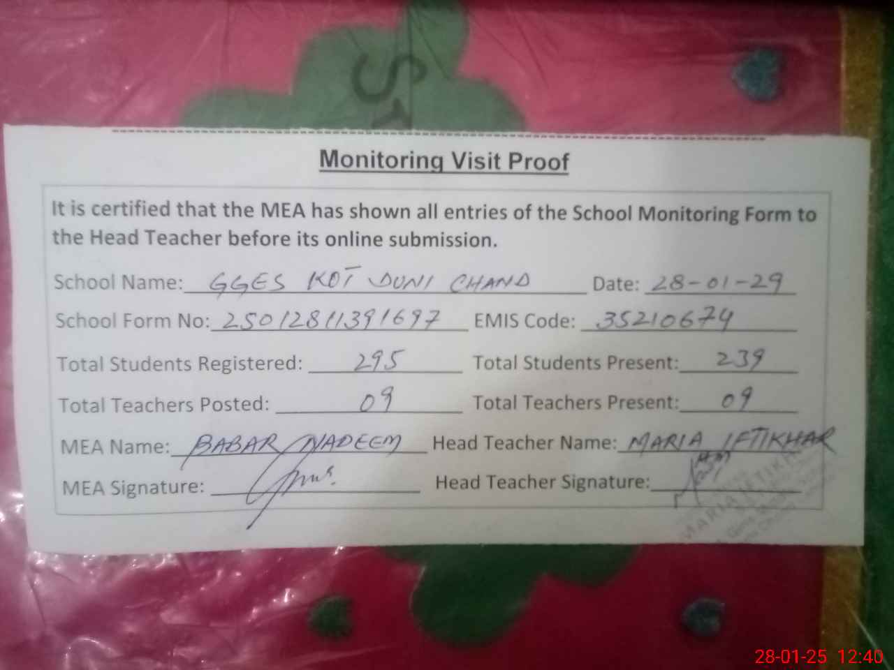 | Certified that this School was Inspected by the Undersigned MEA/DMO Today and the Information Stated Above is as Per Record. | |||||