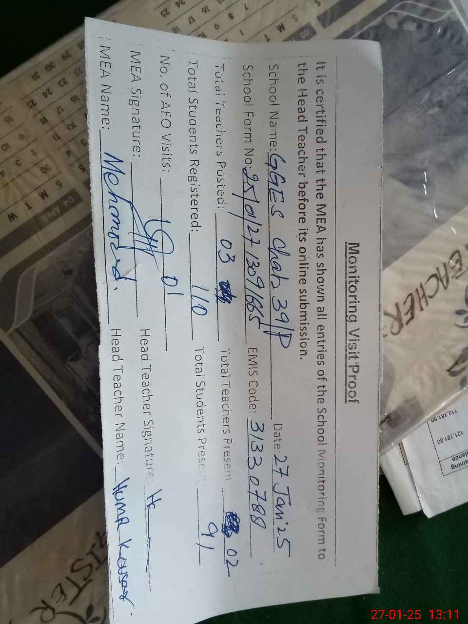 | Attendance Register | Head Teacher | MEA with School | Visit Proof |