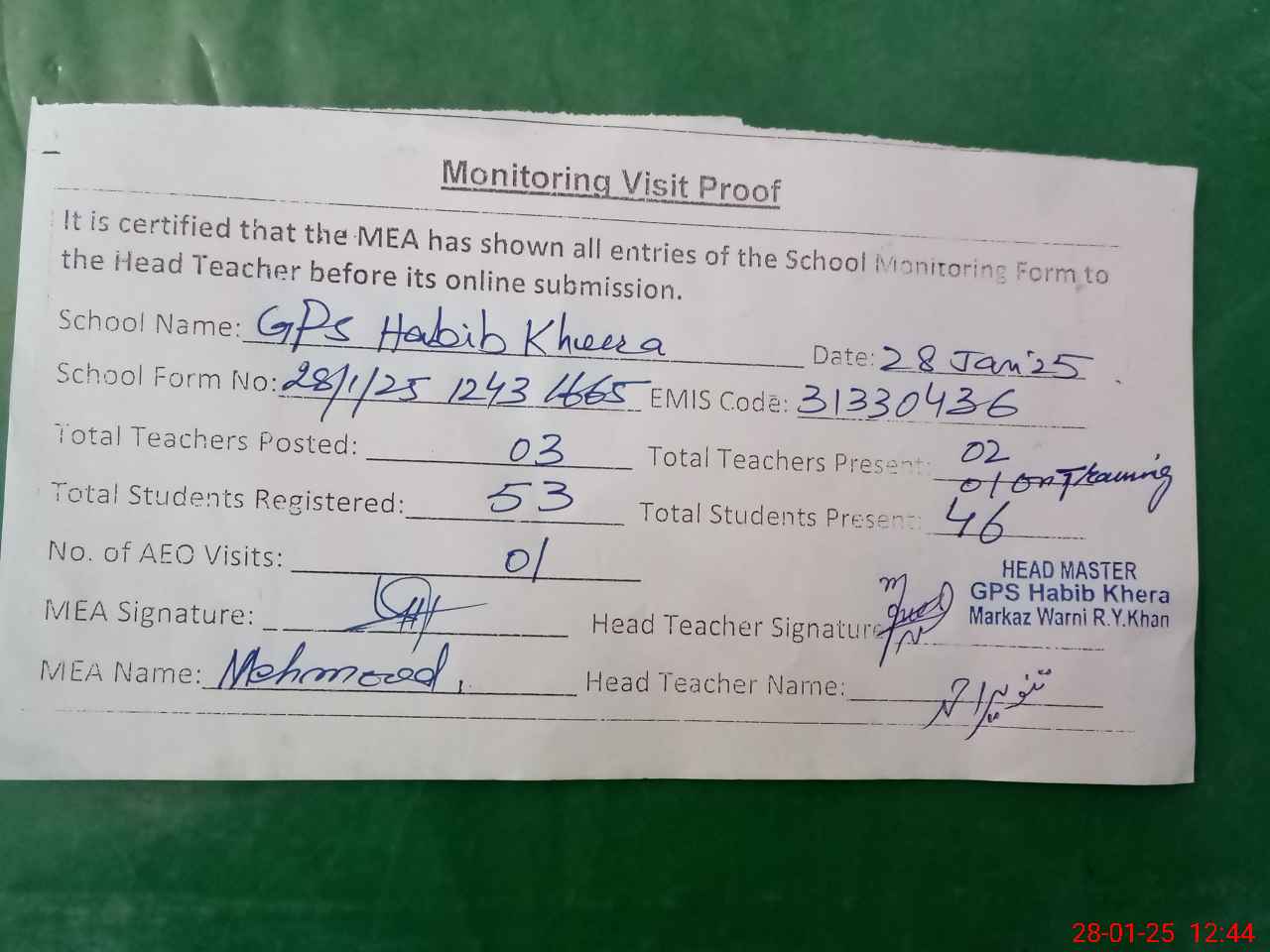 | Attendance Register | Head Teacher | MEA with School | Visit Proof |