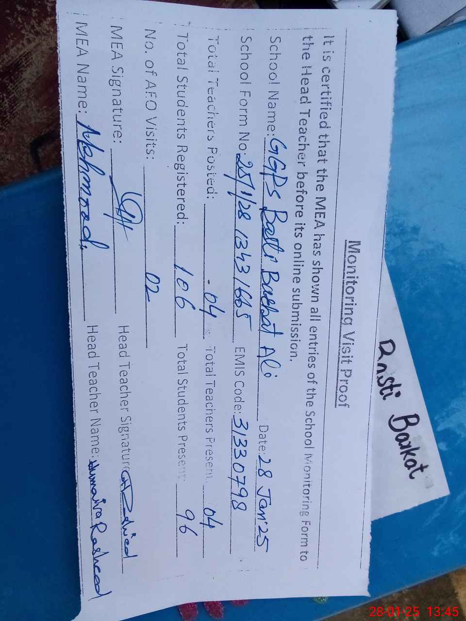 | Attendance Register | Head Teacher | MEA with School | Visit Proof |