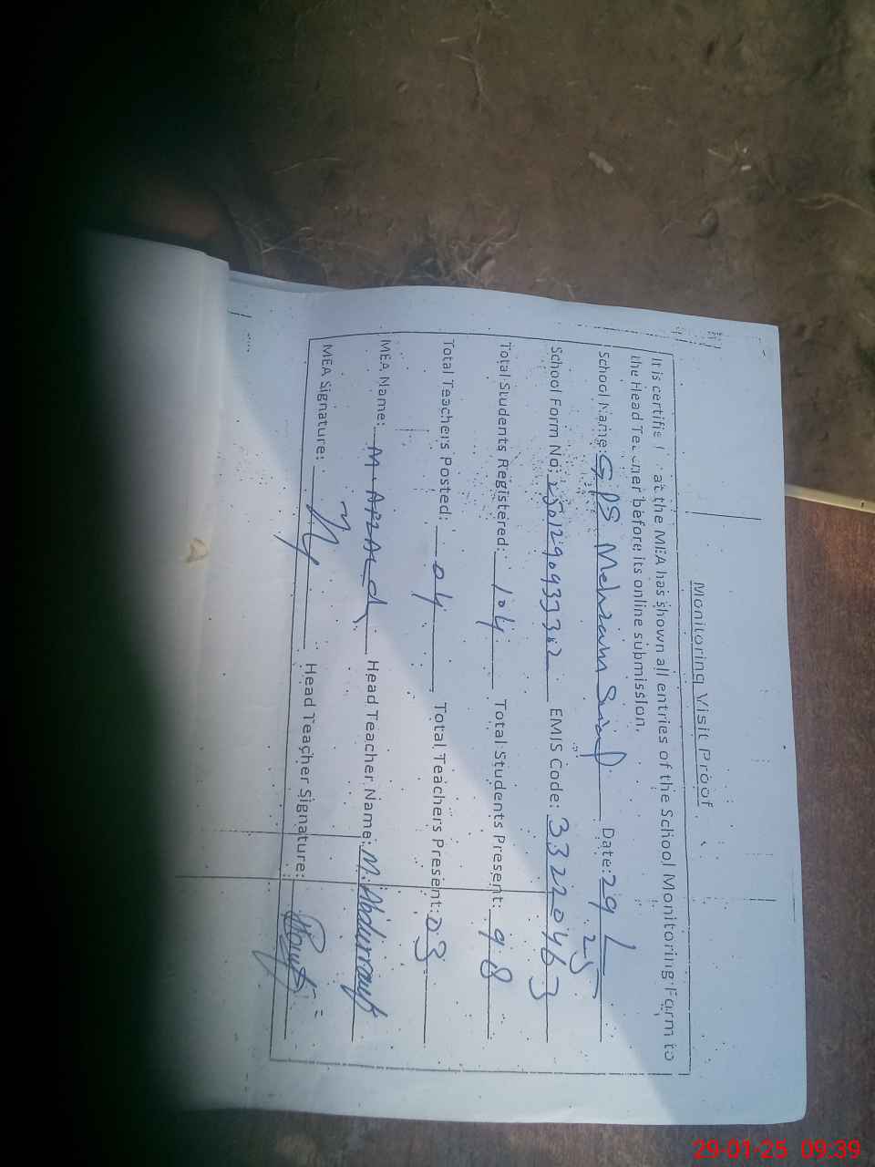 | Attendance Register | Head Teacher | MEA with School | Visit Proof |