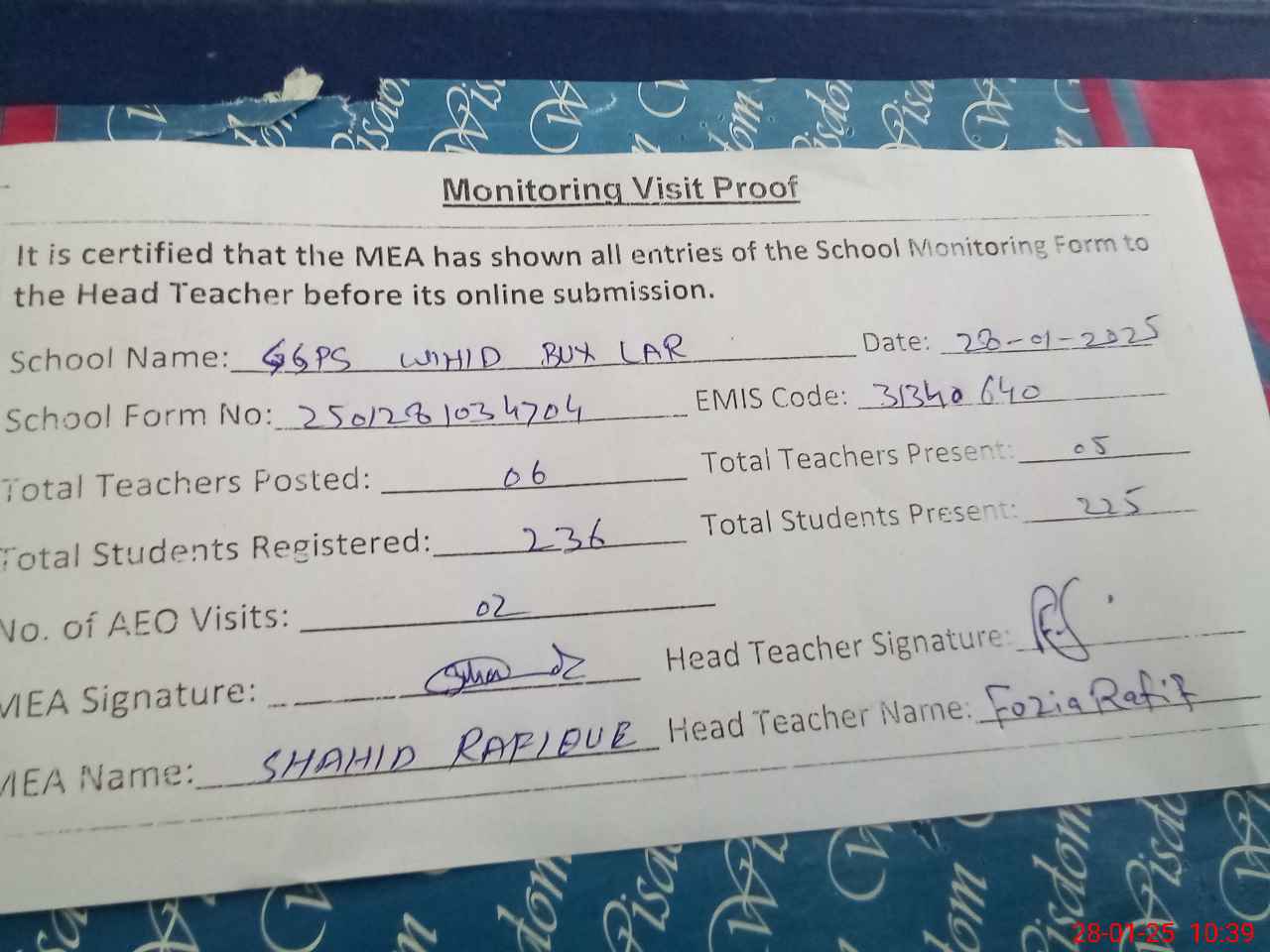 | Attendance Register | Head Teacher | MEA with School | Visit Proof |