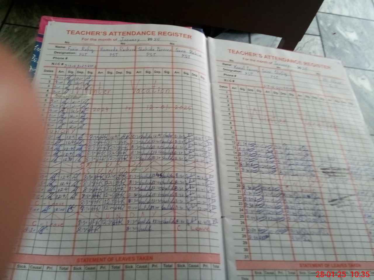 | CNIC | Full Name | Designation | R/C | Absence During Last Calender Month |