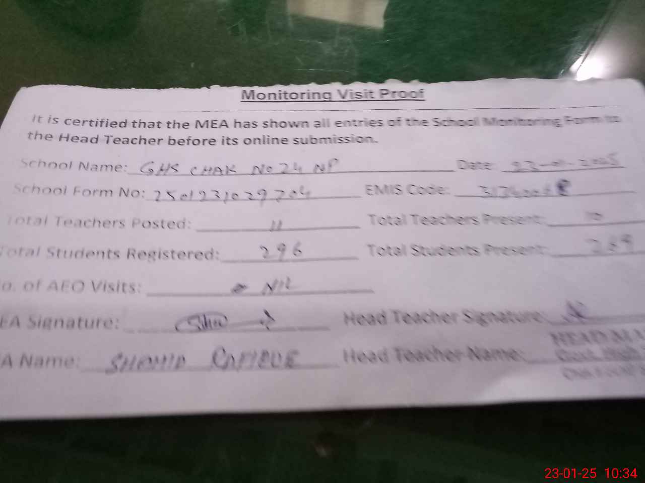 | Attendance Register | Head Teacher | MEA with School | Visit Proof |