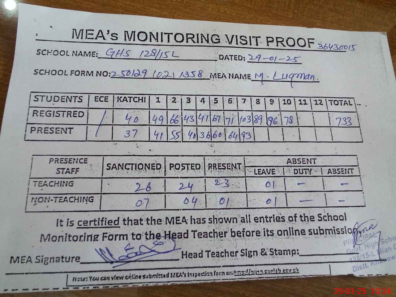 | Certified that this School was Inspected by the Undersigned MEA/DMO Today and the Information Stated Above is as Per Record. | |||||