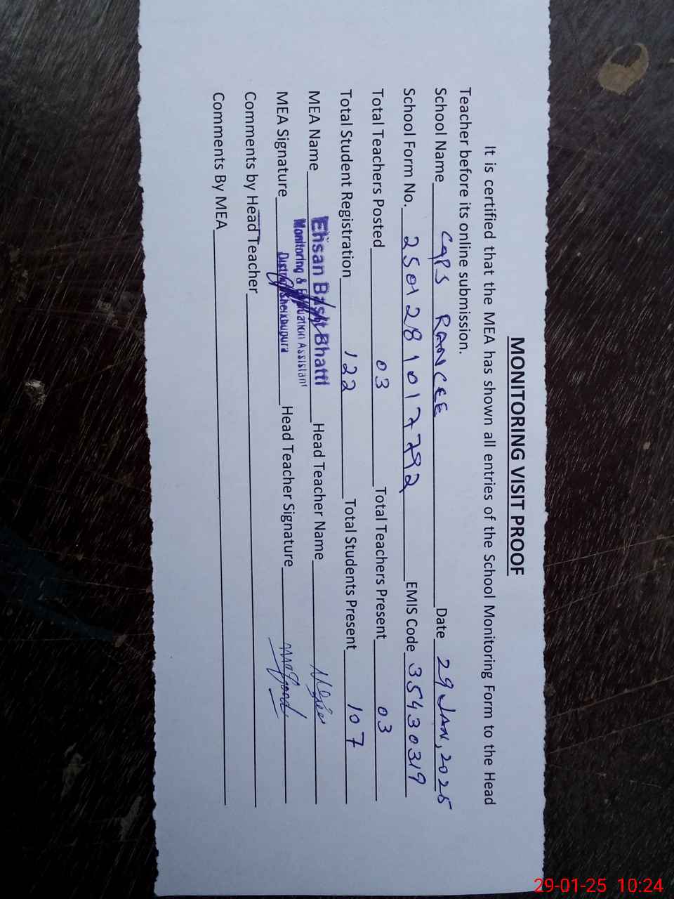 | Attendance Register | Head Teacher | MEA with School | Visit Proof |