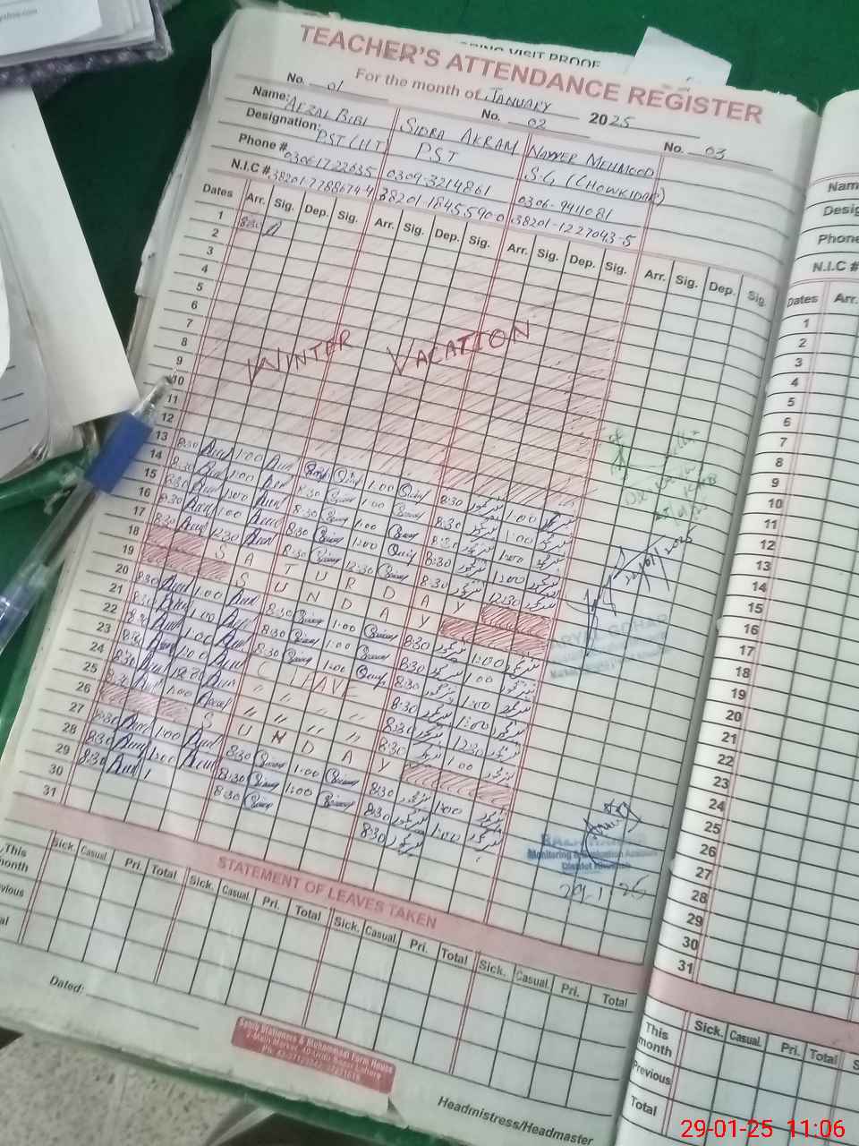 | CNIC | Full Name | Designation | R/C | Absence During Last Calender Month |