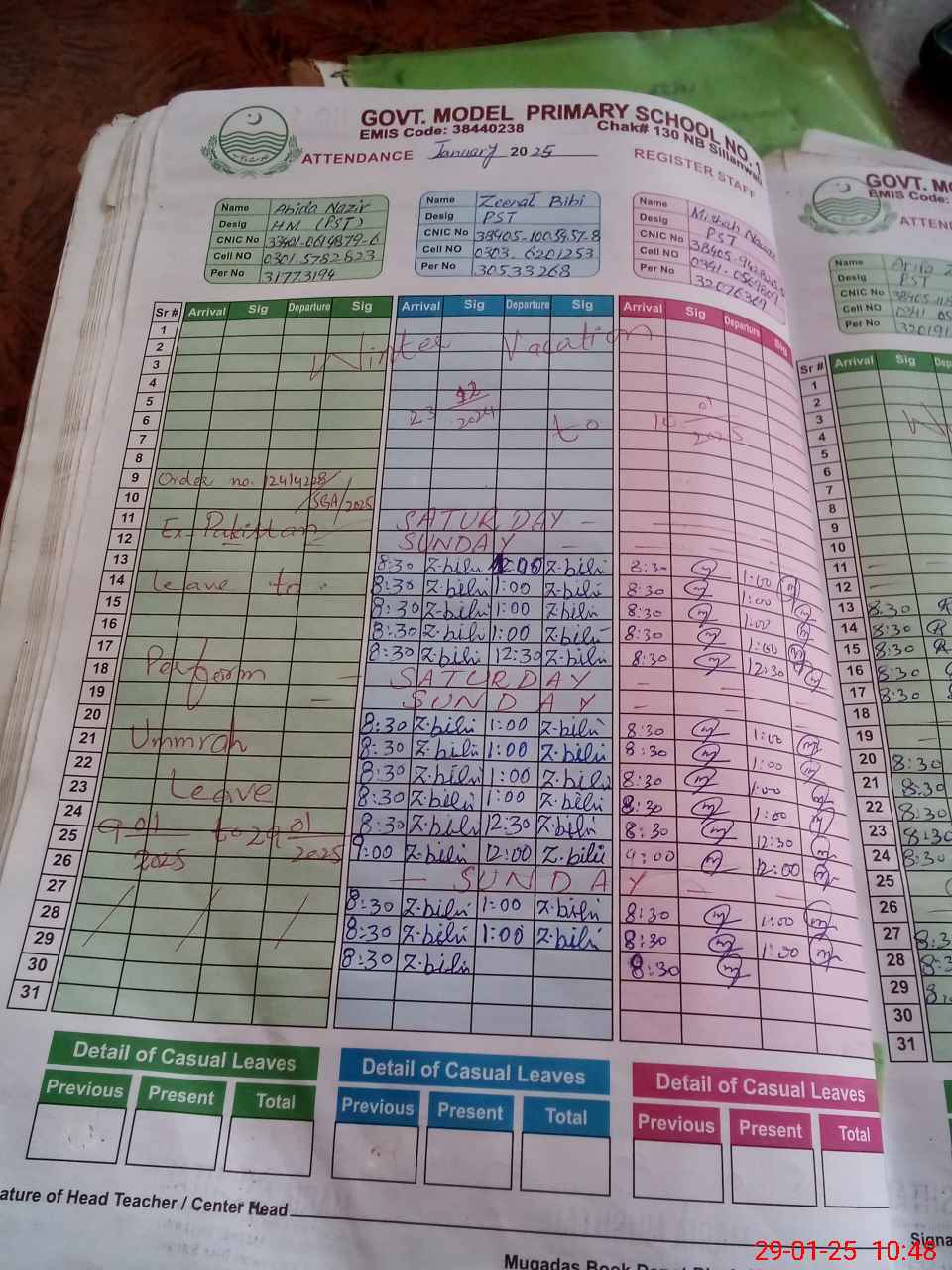 | CNIC | Full Name | Designation | R/C | Absence During Last Calender Month |