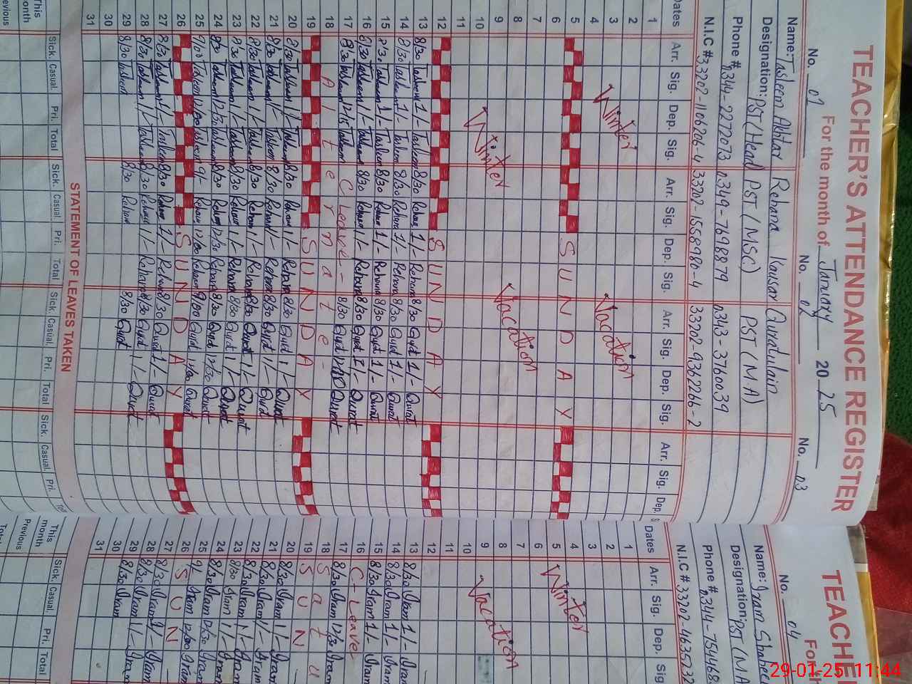 | CNIC | Full Name | Designation | R/C | Absence During Last Calender Month |