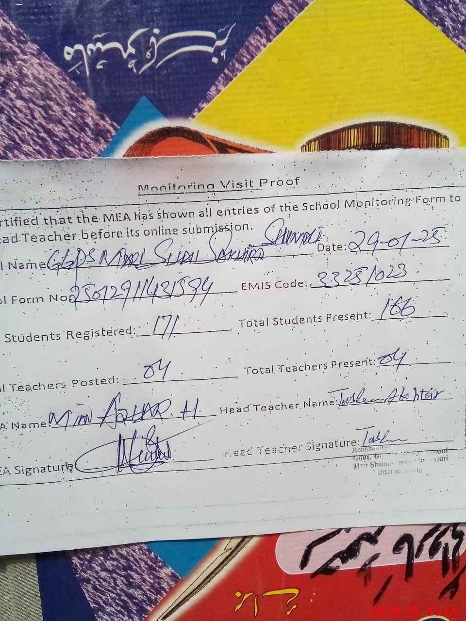 | Attendance Register | Head Teacher | MEA with School | Visit Proof |