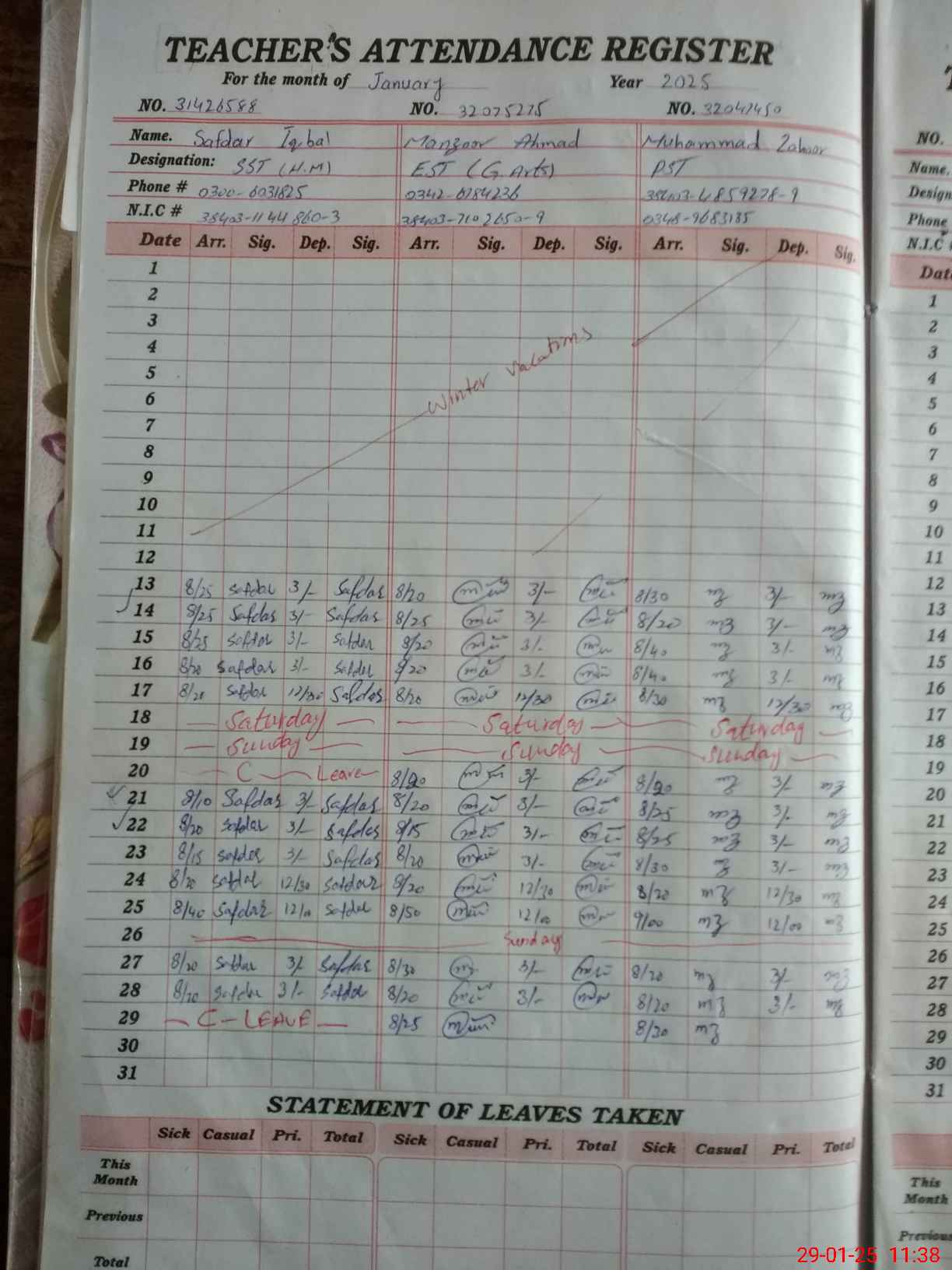 | CNIC | Full Name | Designation | R/C | Absence during last cal. month |