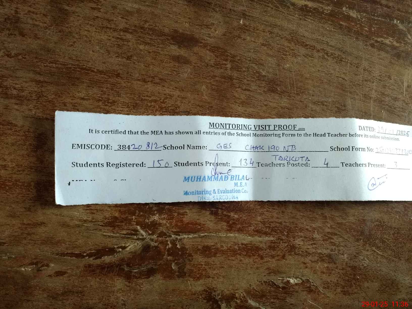 | Attendance Register | Head Teacher | MEA with School | Visit Proof |