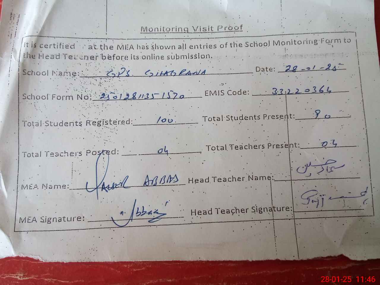 | Attendance Register | Head Teacher | MEA with School | Visit Proof |