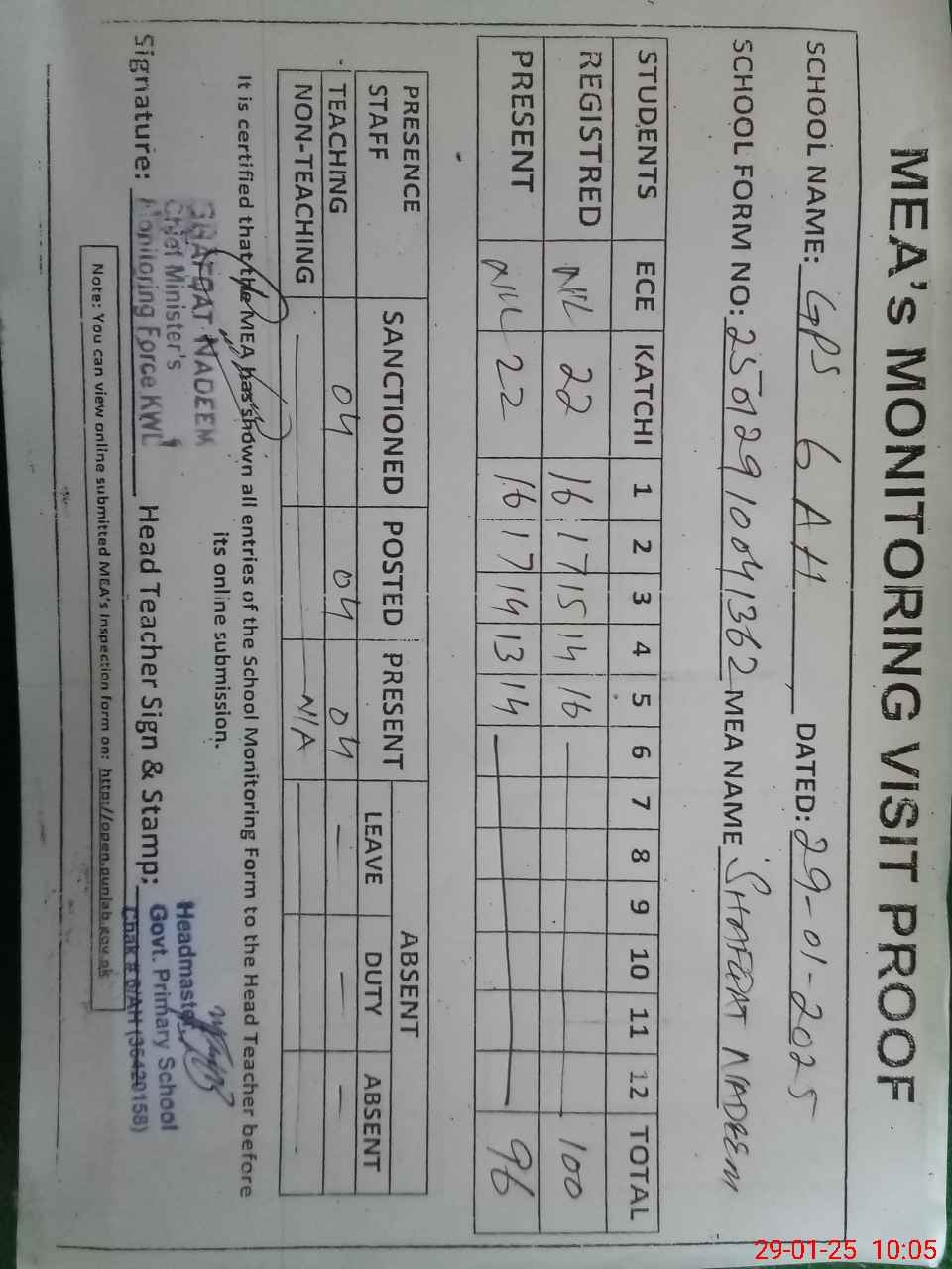 | Attendance Register | Head Teacher | MEA with School | Visit Proof |