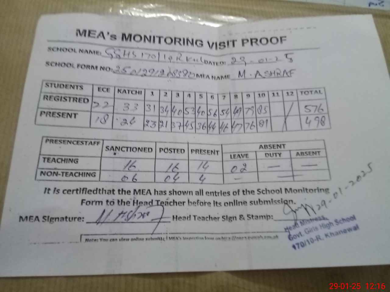 | EMIS Code: 36420094 | Name of School: GGHS 170/10-R, KHANEWAL | |||