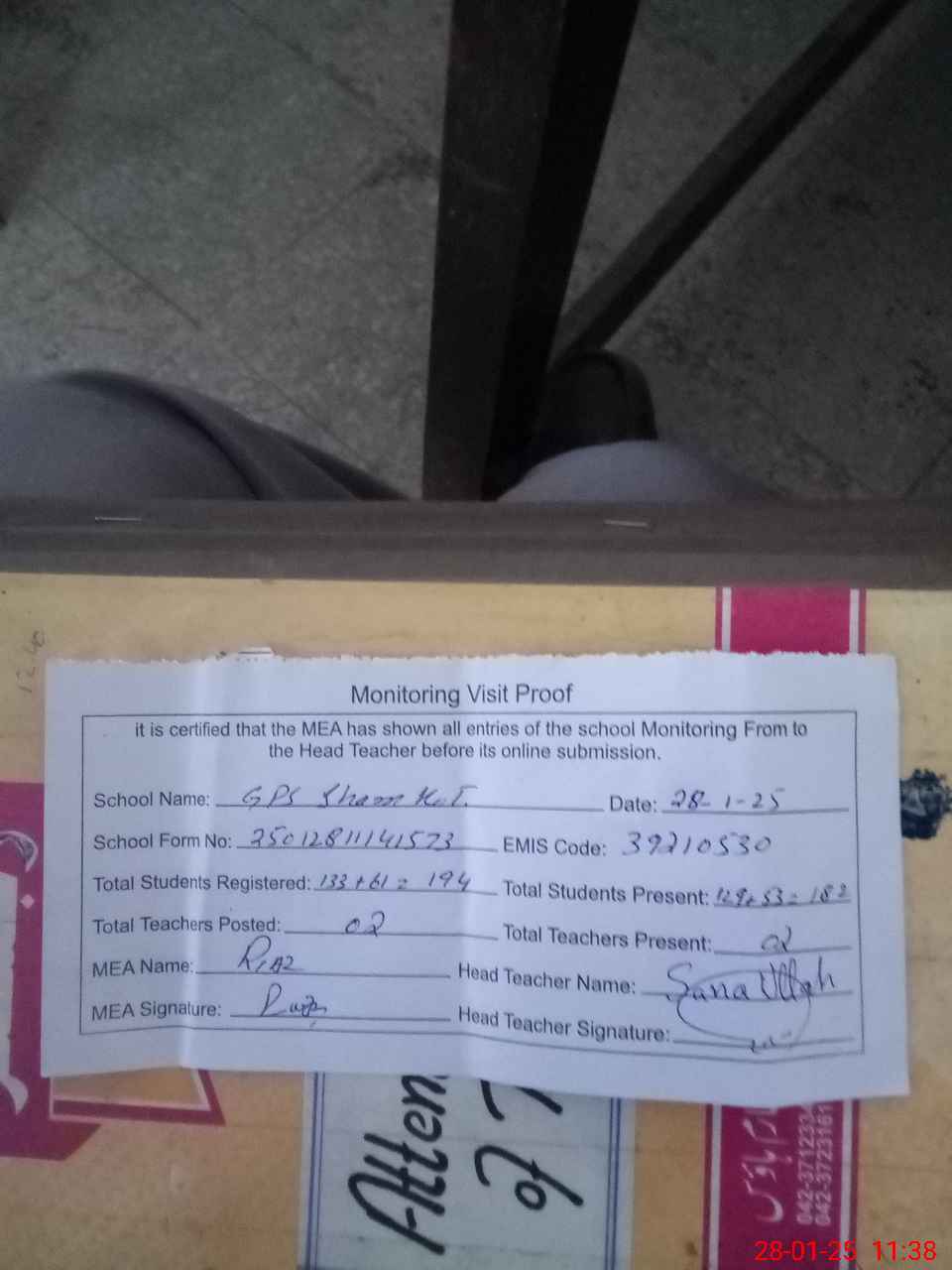 | Attendance Register | Head Teacher | MEA with School | Visit Proof |