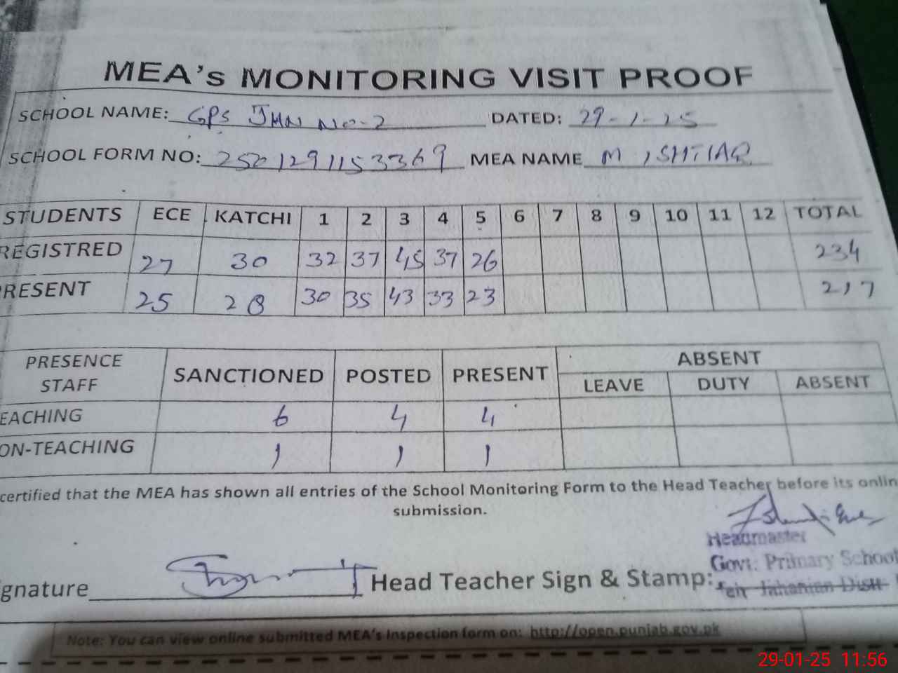 | Attendance Register | Head Teacher | MEA with School | Visit Proof |