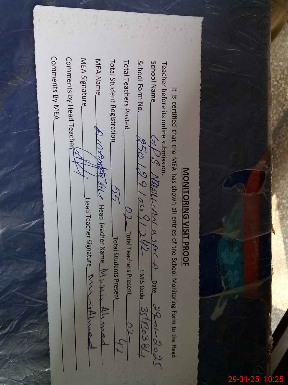 | Attendance Register | Head Teacher | MEA with School | Visit Proof |