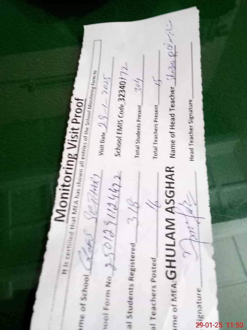 | Attendance Register | Head Teacher | MEA with School | Visit Proof |