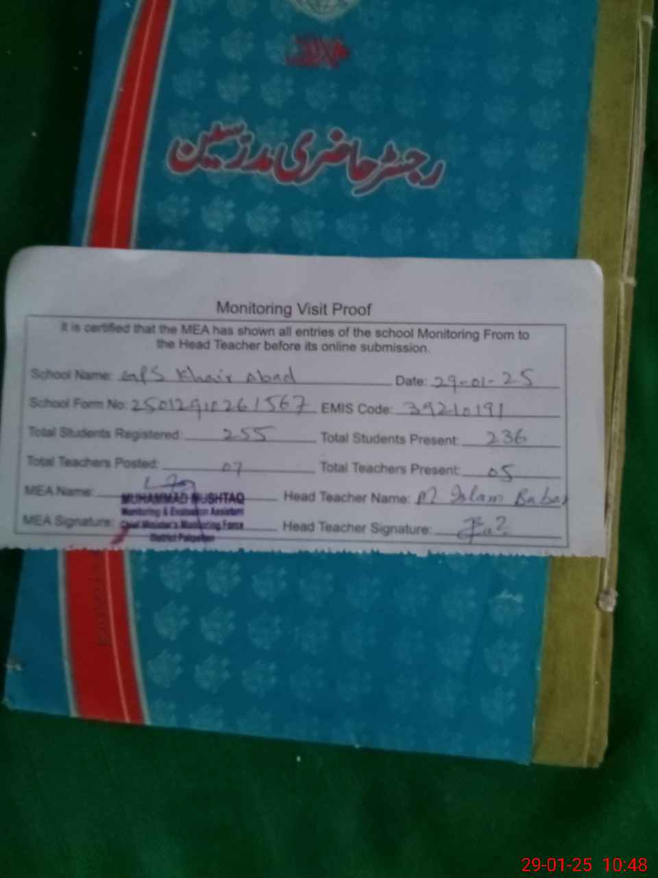 | Attendance Register | Head Teacher | MEA with School | Visit Proof |