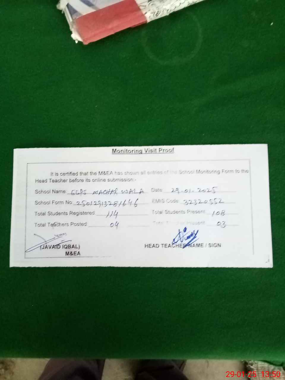 | Attendance Register | Head Teacher | MEA with School | Visit Proof |