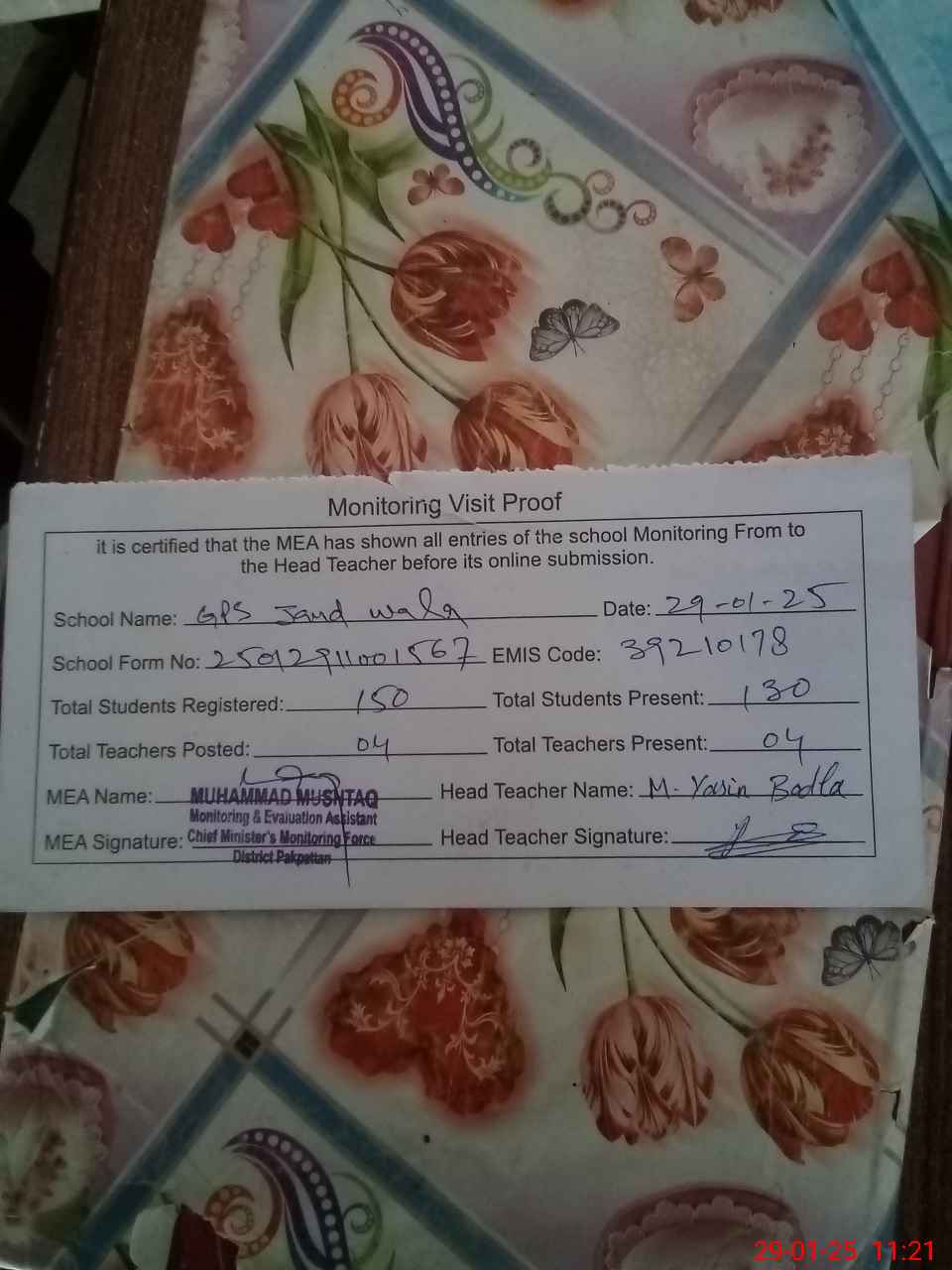 | EMIS Code: 39210178 | Name of School: GPS JAND WALA PO PAKPATTAN | |||