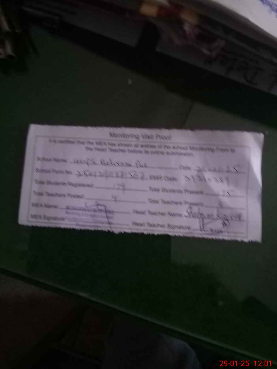 | Attendance Register | Head Teacher | MEA with School | Visit Proof |