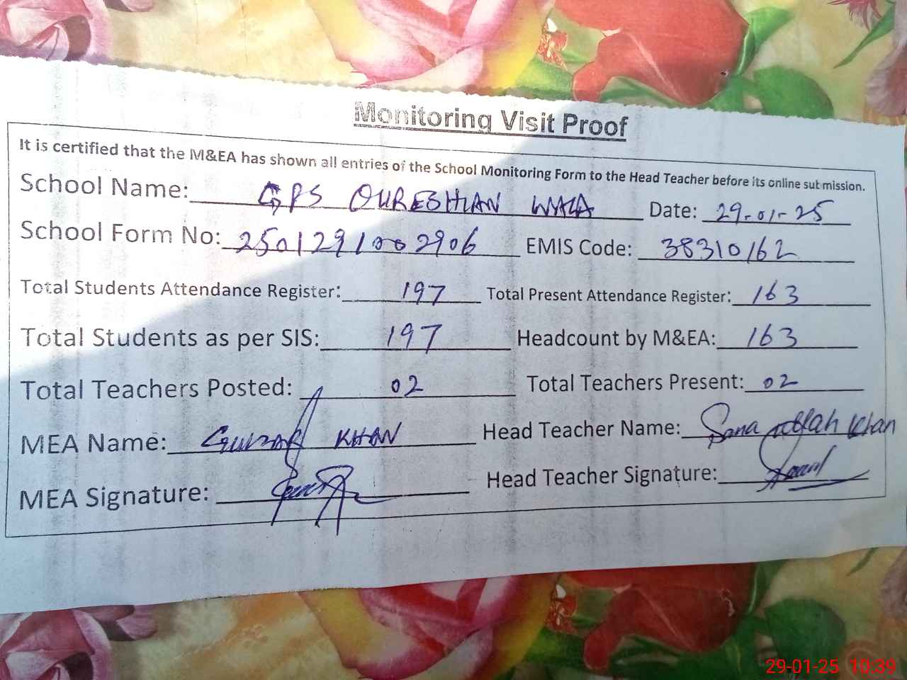| Attendance Register | Head Teacher | MEA with School | Visit Proof |